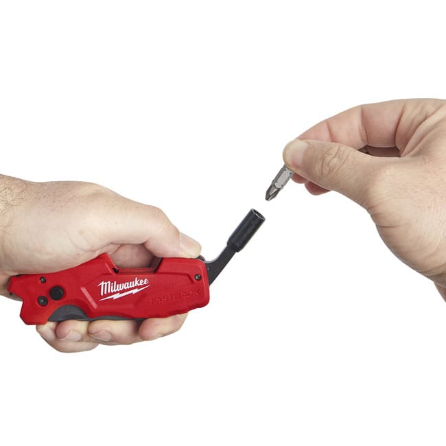 Milwaukee 48221505 FASTBACK™ 6 in 1 Folding Utility Knife . Our FASTBACK™ 6-in-1 Folding Utility Knife features a press and flip mechanism providing you with an easy, one-handed opening. The 6 features in 1 knife has a wire stripper, folding screwdriver, and a fold-out 1/4" bit holder. The bit holder includes a reversible Phillips #2 and.